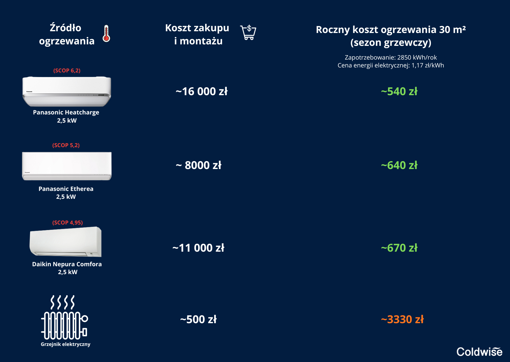 Aby porównać opłacalność ogrzewania klimatyzacją i tradycyjnym grzejnikiem elektrycznym, przyjęliśmy realistyczne założenia odpowiadające typowym warunkom domowym. Analiza dotyczy powierzchni 30 m², czyli wielkości standardowego salonu lub małego mieszkania. Roczne zapotrzebowanie cieplne oszacowano na 2850 kWh, zgodnie z normą WT 2017. Do obliczeń przyjęliśmy średnią cenę energii elektrycznej na poziomie 1,17 zł za kWh (taryfa G11 ENEA).