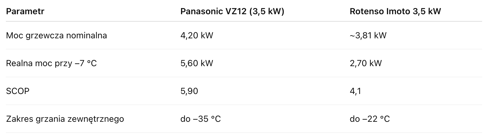Teraz wyraźnie widać różnicę między rozwiązaniem Panasonica a tańszą klimatyzacją produkcji chińskiej. Choć w katalogu oba urządzenia mają deklarowane 3,5 kW, to w praktyce zimowej ich możliwości są zupełnie inne.